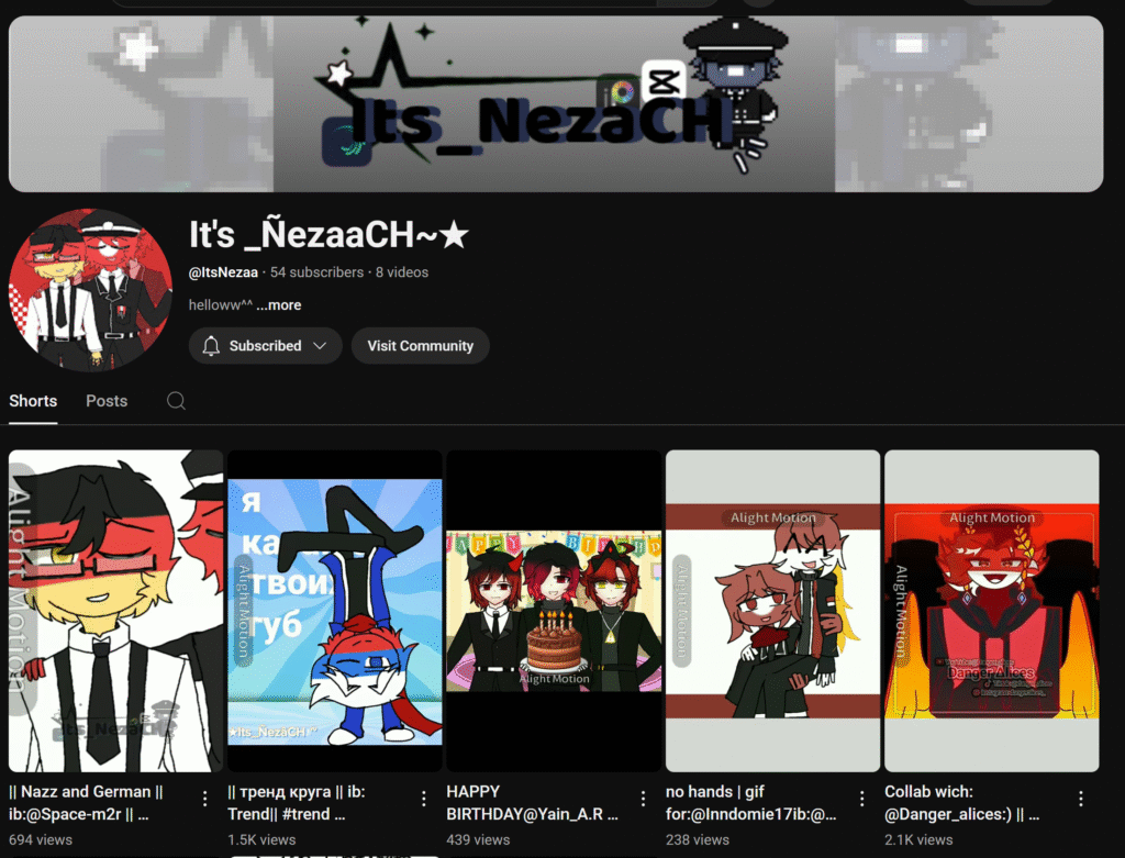 Channel pertama buat akun khusus CountryHumans muehehe tapi aku jarang uploand karna jarang megang hp dan buat bikin animasi CH harus gambar sendiri jadi yaaa agak lama memang, bisa ngabisin 1 hari full buat 1 video